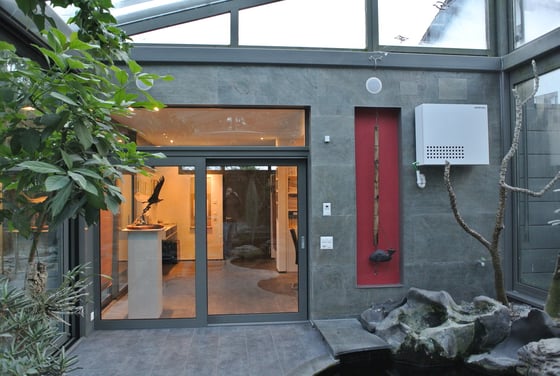Wintergarten mit tropischen Pflanzen, Koi-Teich und damit extrem hoher Luftfeuchtigkeit.