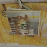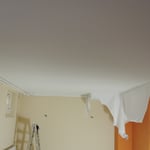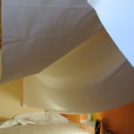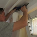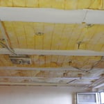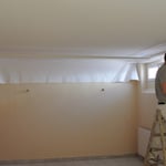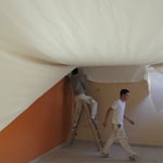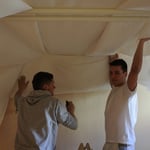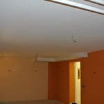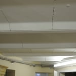 Ablauf der Montage in einem Raum im UG, bestehende Rippendecke, Randlatte setzen, Akustikwolle versetzen mittels Dübel, Lampenstellen definieren und Unterkonstruktion montieren, Akustikgewebe einhängen, verspannen und schneiden.