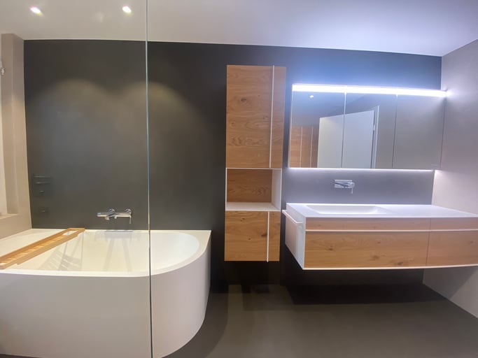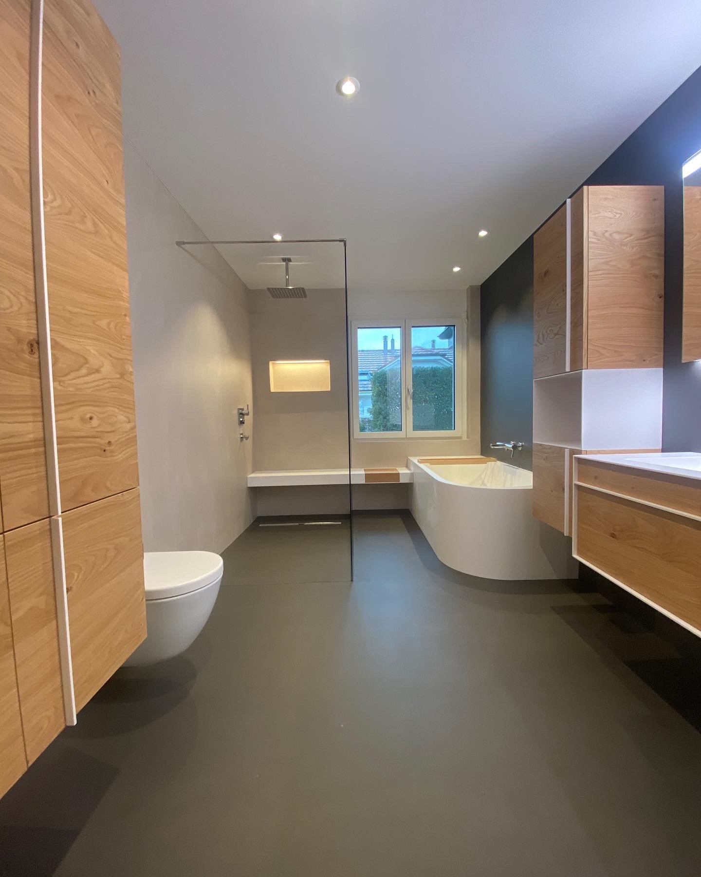 Fugenlose Nassraumbeschichtung mit mineralischer Optik und eine Akustikspanndecke mit tuchmatter, weisser Erscheinung.